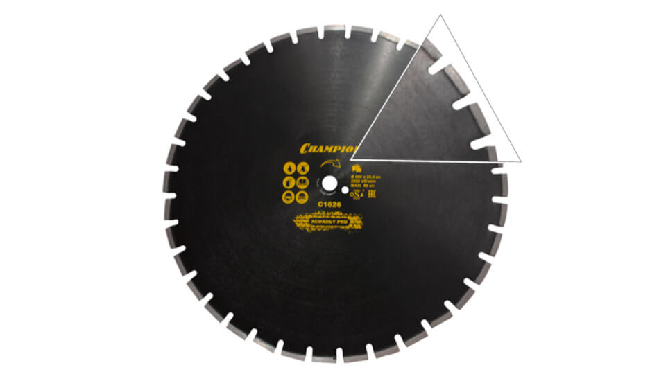 Особенности: наклонённые сегменты обеспечивают эффективную защиту корпуса диска от стирания при резке абразивных материалов; широкие межсегментные канавки для быстрого удаления отходов.