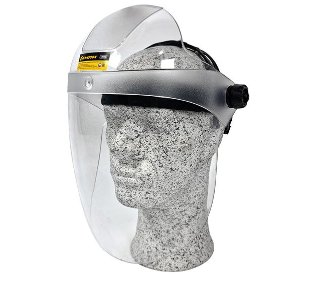 Щиток защитный поликарбонатный с наголовником Champion (C1012) полностью защищает голову, лицо и шею от твердых частиц и брызг жидкостей за счёт большой площади.