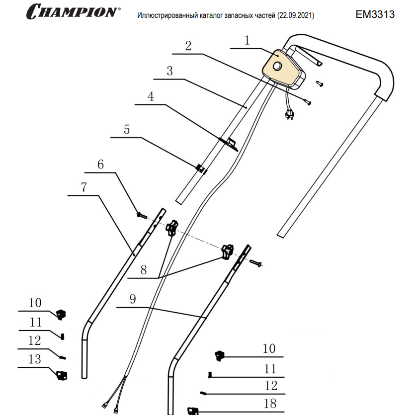 1 | РУЧКА - ВЫКЛЮЧАТЕЛЬ | Запчасти для газонокосилки чемпион ЕМ3313 | обновлена с 22.09.2021 года | Поставка по России | Магазин-Сервис в СПБ |