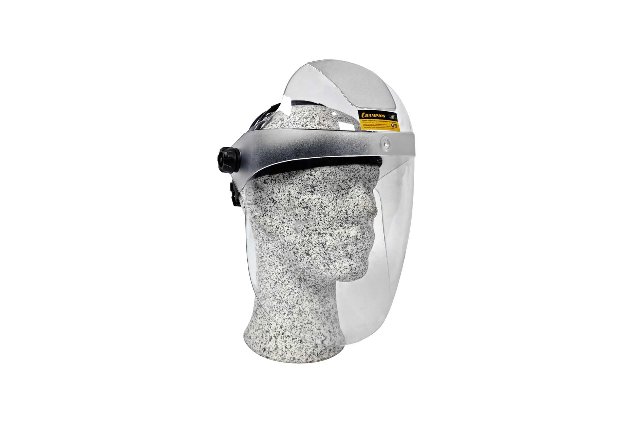 Щиток защитный поликарбонатный с наголовником Champion (C1012) полностью защищает голову, лицо и шею от твердых частиц и брызг жидкостей за счёт большой площади.