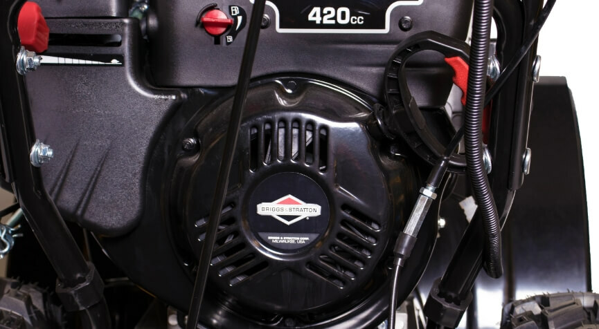 - Благодаря четырехтактному верхнеклапанному двигателю с одним цилиндром снегоуборщик наделен увеличенным ресурсом эксплуатации. Он нетребователен к горючему, не сильно шумит и вибрирует, а также может достигать мощности в 13.5 лошадиных сил, обладая цилиндром с объемом в 420 кубических сантиметров.
