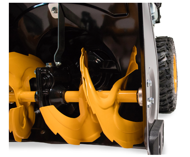 Для разгрузки снега в нужном направлении необходимо задать подходящий угол разворота разгрузочному желобу. Металлический шнек с зубьями отлично справляется с уборкой больших сугробов, и измельчением слежавшегося снега.