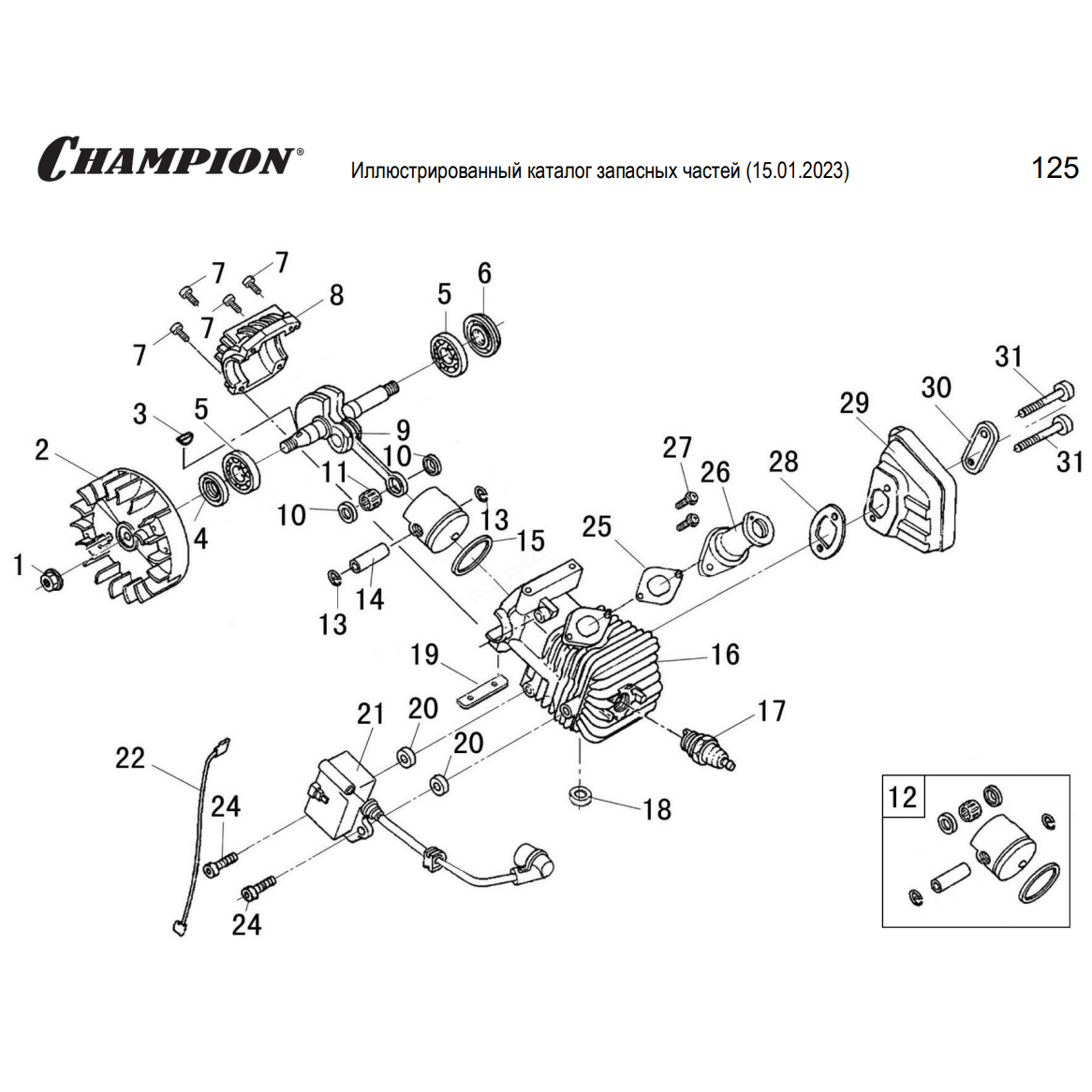 1 | Запчасти для бензопилы чемпион 125-Т | | обновлённая деталировка после 15.01.2023 года | ПОРШЕНЬ - ЦИЛИНДР - СВЕЧА - МАХОВИК - МАГНЕТО | Поставка по России | Магазин-Сервис в СПБ |