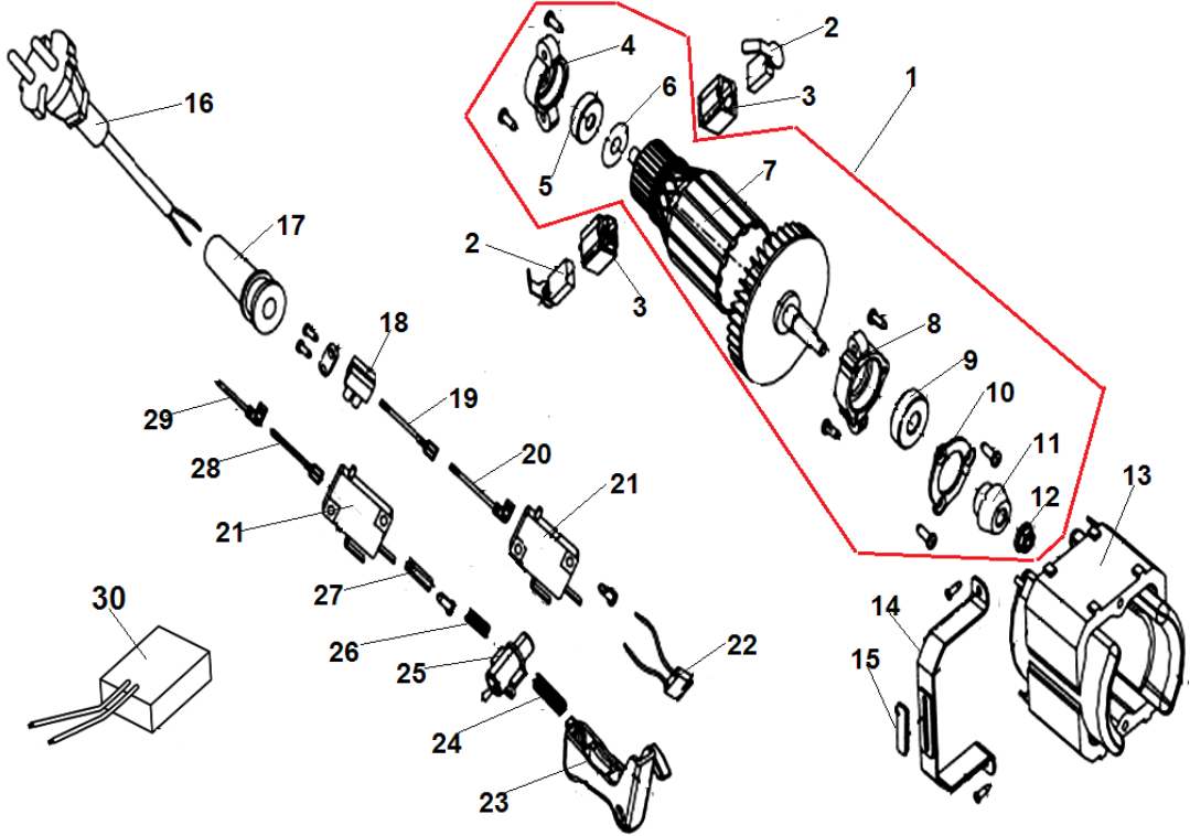 3 ВЫКЛЮЧАТЕЛЬ - ЯКОРЬ - СТАТОР - ЩЕТКИ | Запчасти для электропилы чемпион 424N-18 | Поставка по России | Магазин-Сервис в СПБ |