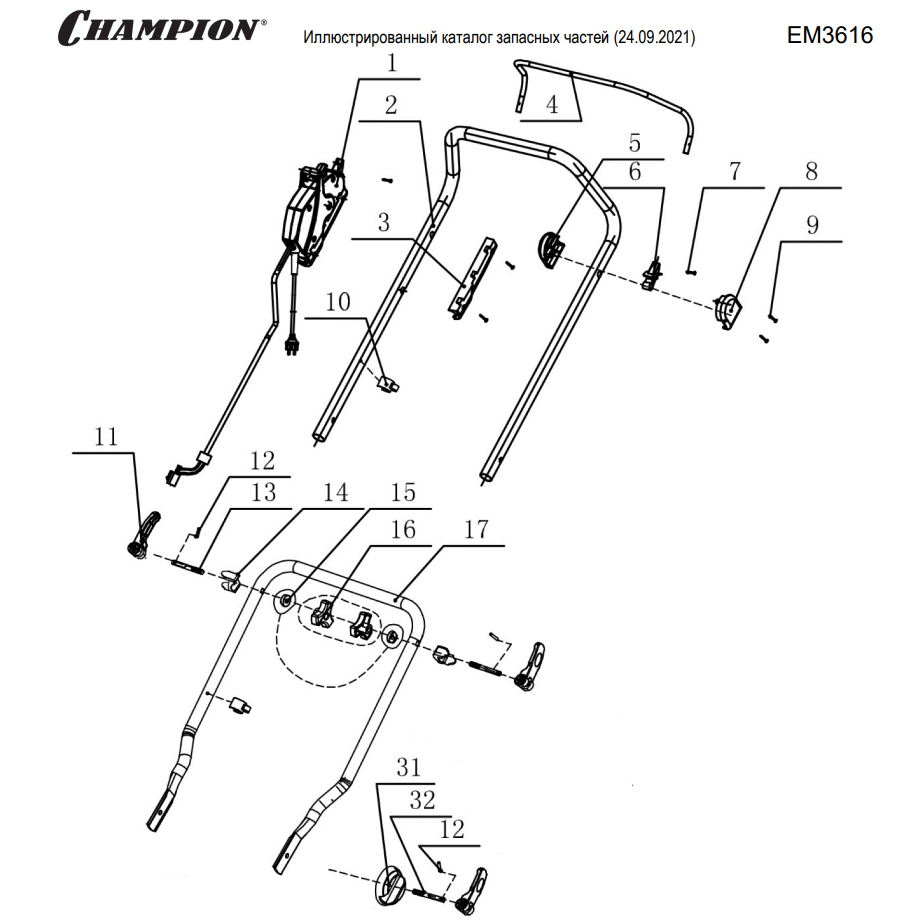 1 | РУЧКА - ВЫКЛЮЧАТЕЛЬ | Запчасти для газонокосилки чемпион EM3616 | обновлена 24.09.2021 года | Поставка по России | Магазин-Сервис в СПБ |