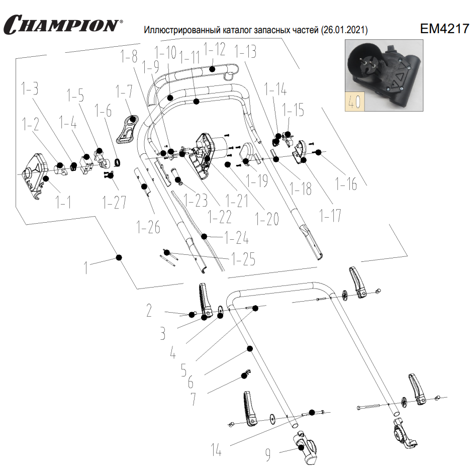 1 | РУЧКА - ВЫКЛЮЧАТЕЛЬ | Запчасти для газонокосилки чемпион EM4217 | Поставка по России | Магазин-Сервис в СПБ |