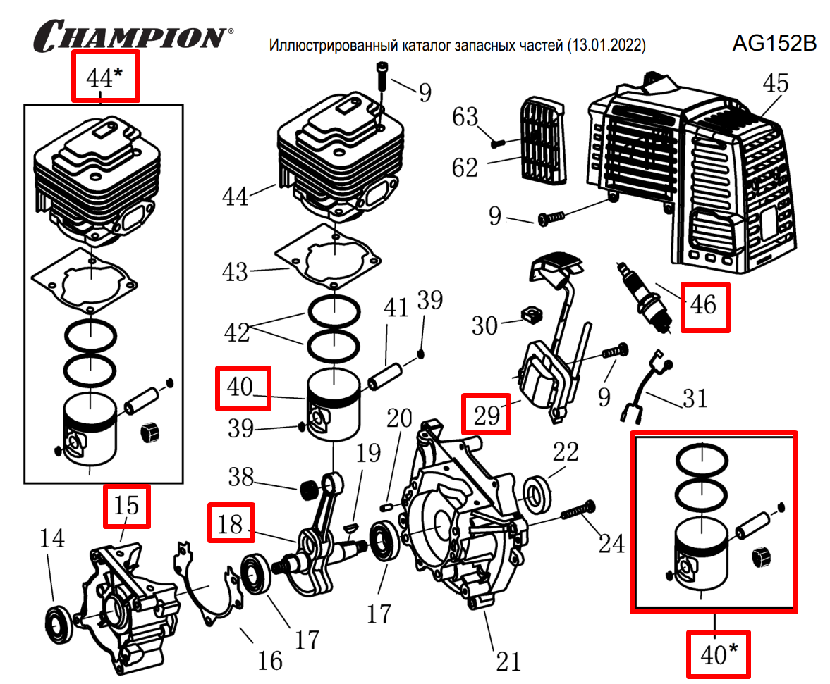 4 | ПОРШЕНЬ - КОЛЕНВАЛ- КОЛЬЦА | Запчасти для мотобура чемпион | AG152B | Поставка по России | Магазин-Сервис в СПБ |