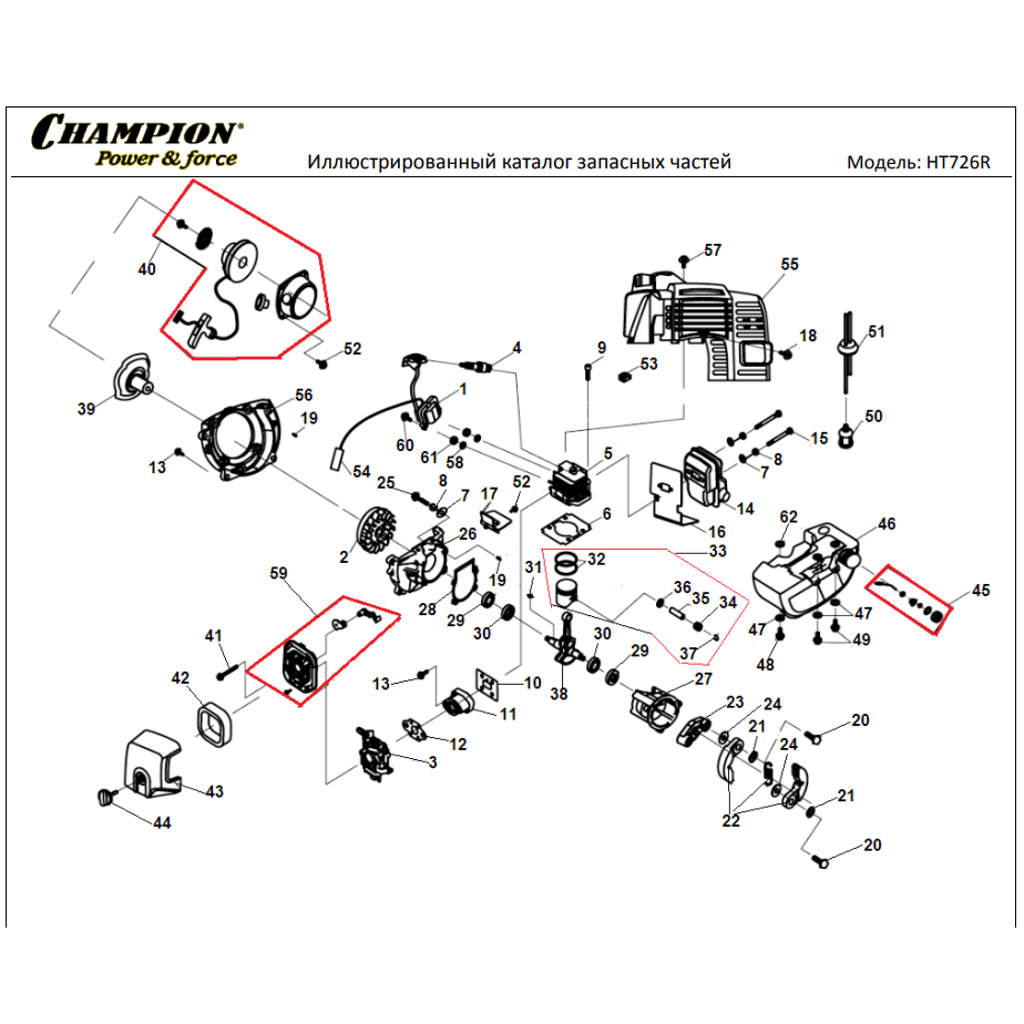 1 ПОРШЕНЬ - ЦИЛИНДР - КОЛЕНВАЛ - КОЛЬЦА - МАГНЕТО - МАХОВИК - СТАРТЕР | Запчасти для ножниц садовых чемпион HT726R | Поставка по России | Магазин-Сервис в СПБ |
