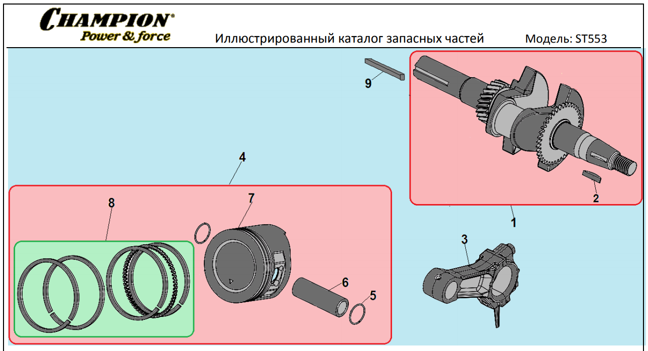 7 ПОРШЕНЬ -ЦИЛИНДР -КОЛЕНВАЛ- КОЛЬЦА | Запчасти для снегоуборщика чемпион ST553 | Поставка по России | Магазин-Сервис в СПБ |