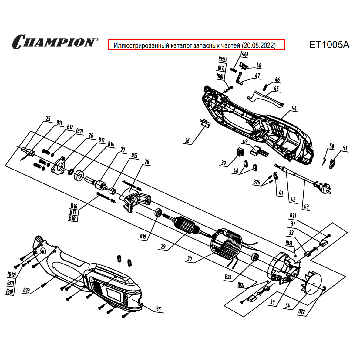 1 Электродвигатель - Щетки - Якорь - Статор - Выключатель | Запчасти для триммера чемпион | обновленная деталировка после 20.08.2022 года ЕТ1005А | Поставка по России | Магазин-Сервис в СПБ |