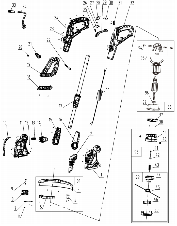 1 Электродвигатель - Щетки - Головка - Кожух - Якорь - Статор | Запчасти для триммера чемпион ЕТ452 до 20.03.2020 года | Поставка по России | Магазин-Сервис в СПБ |